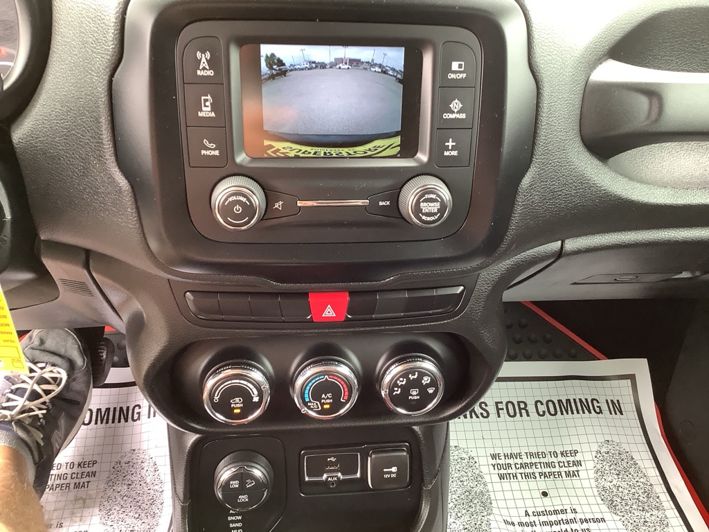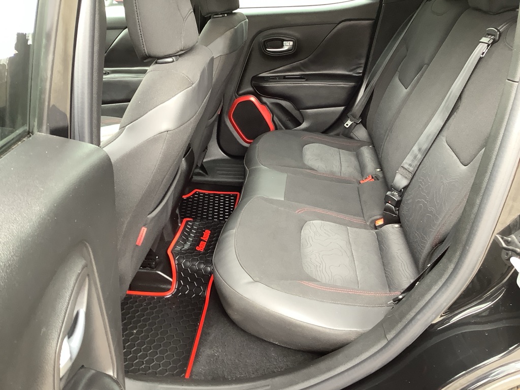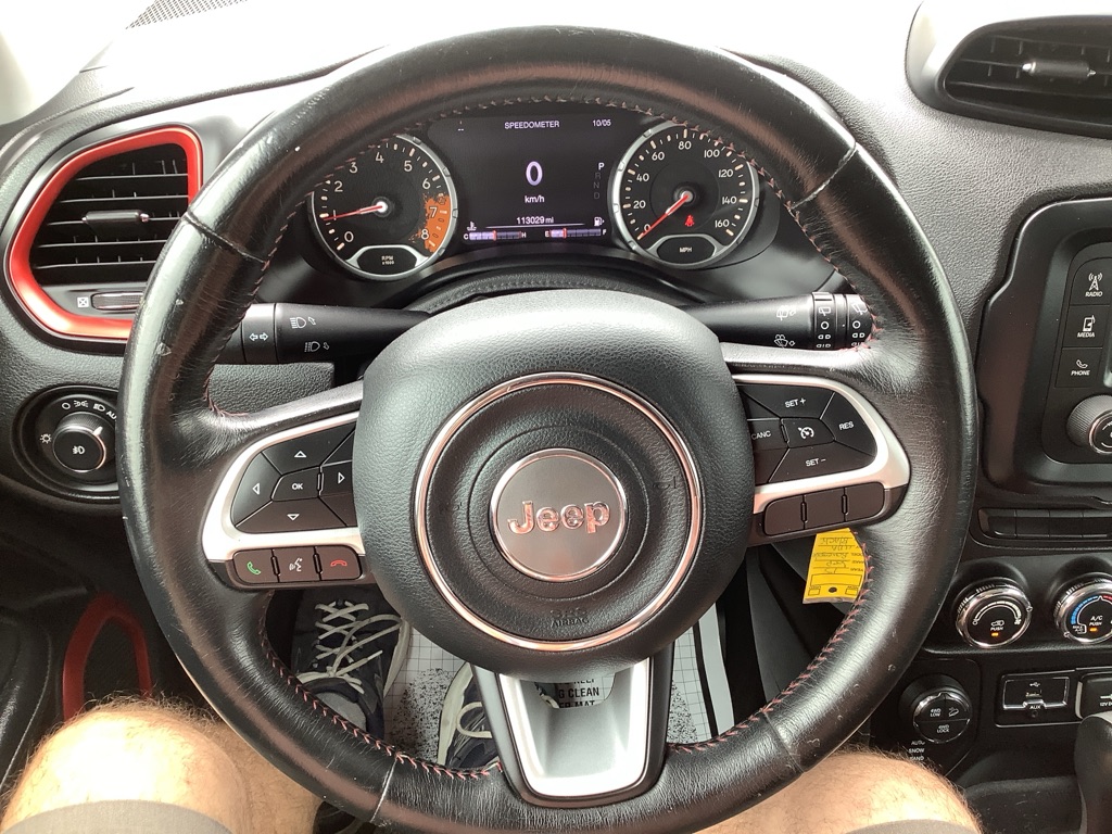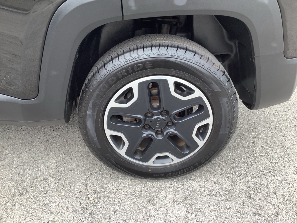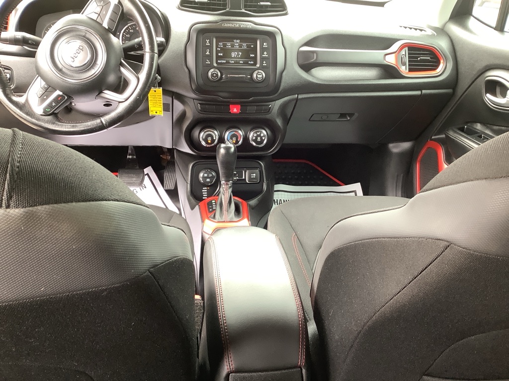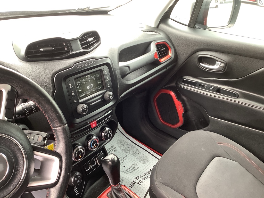 4 Wheel Drive Air Conditioning Anti-Lock Brakes Automatic Headlights Bluetooth Connection Brake Assist System Child Safety Locks Cruise Control Cylinders (4) Daytime Running Lights Driver Air Bag Engine Immobilizer Fog Lamps Heated Mirrors Intermittent Wipers Keyless Entry Keyless Entry ((1)Left) Leather Steering Wheel Master Key (1) Motor Fuel Type ((1)Gas) MP3 player Pass-Through Rear Seat Pass. Air Bag Power Brakes Power Locks Power Mirrors Power Steering Power Windows Privacy Glass Radio-AM/FM Rear Defroster Rear Floor Mats Rear Spoiler Reverse Camera Seat Trim ((1)Cloth) Side Airbags - Front Spare Tire ((1)Full Size) Steering Wheel Controls Stereo ((5)AM/FM Radio) Tilt Steering Wheel Tilt Wheel Tire Pressure Monitor System Traction Control Transmission ((1)Automatic Transmission) Trip Computer Turn Signal Mirrors Wheels Front Left ((3)Aluminum) Wheels Front Right ((3)Aluminum) Wheels Rear Left ((3)Aluminum) Wheels Rear Right ((3)Aluminum The 2015 Jeep Renegade Trailhawk, a 4-wheel drive, 4-door SUV, features a 2.4-liter 4-cylinder gasoline engine, known for its off-road capabilities with features like 8.7 inches of ground clearance and skid plates. Engine: 2.4-liter 4-cylinder gasoline engine. Drive: 4-wheel drive (4WD). Body Style: 4-door SUV. Off-Road Features: Trail Rated badge. 8.7 inches of ground clearance. Skid plates. Red tow hooks front and rear. 19 inches of water-fording capability.
