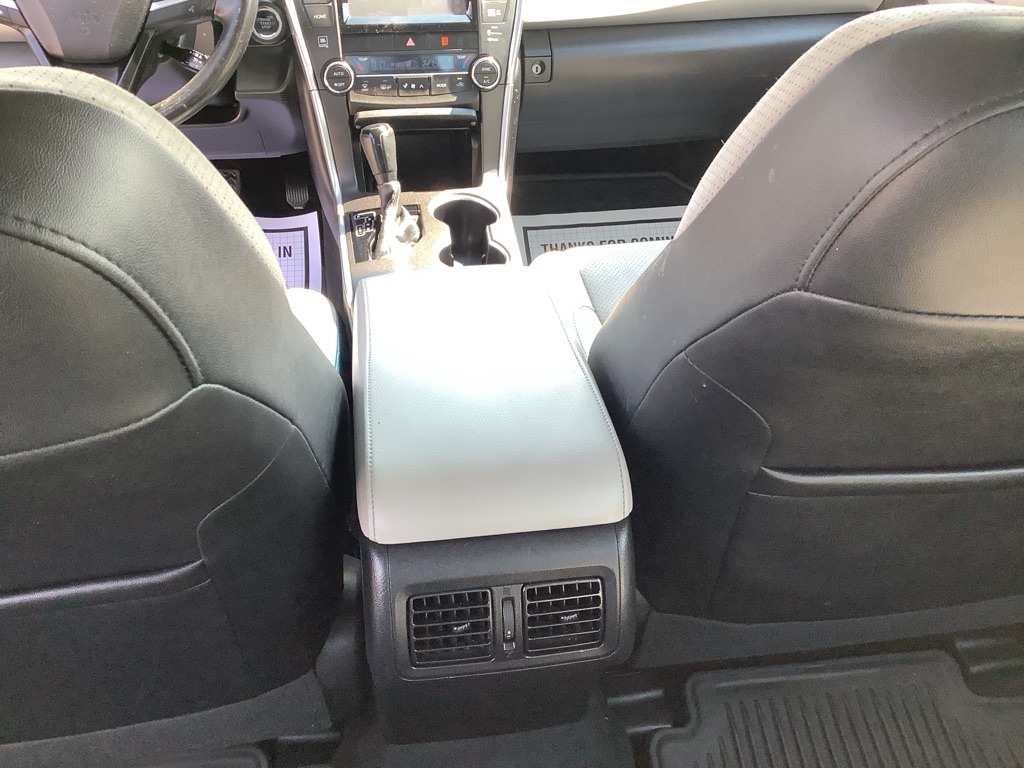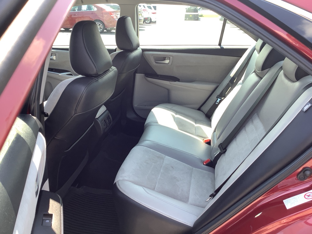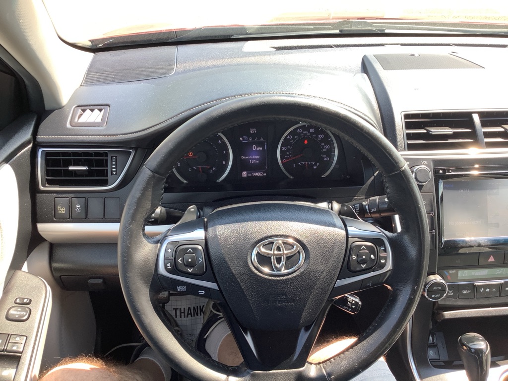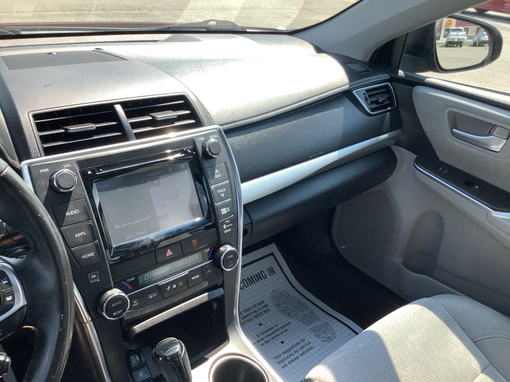 A/C ABS-Brakes Auto-Dimming Rearview Mirror Automatic Headlights CD Player Child Safety Locks Climate Control Cruise Control Daytime Running Lights Driver Air Bag Driver Vanity Mirror Engine Immobilizer Floor Mats Front Head Air Bag Front Side Air Bag Knee Air Bag Leather Steering Wheel Passenger Air Bag Passenger Air Bag Sensor Passenger Vanity Mirror Power Brakes Power Door Locks Power Mirror(s) Power Outlet Power Steering Power Windows Rear Defrost Rear Head Air Bag Rear Side Air Bag Rear Spoiler Remote Trunk Release Security System Stability Control Steering Wheel Audio Controls Tilt Steering Wheel Tire Pressure Monitor Traction Control Trip Computer Universal Garage Door Opener Variable Speed Intermittent Wipers Front Bucket Seats Rear Bench Seat Driver Adjustable Lumbar Heated Front Seat Pass-Through Rear Seat Power Driver Seat Power Passenger Seat The 2015 Toyota Camry XSE V6 features a 3.5-liter V6 engine producing 268 horsepower and 248 lb-ft of torque, paired with a 6-speed automatic transmission, offering a sporty driving experience with features like paddle shifters and a sport mode. Engine & Performance: Engine: 3.5-liter V6 engine Horsepower: 268 hp Torque: 248 lb-ft Transmission: 6-speed automatic with manual shifting mode Drivetrain: Front-wheel drive Fuel Economy: EPA-estimated 21/31 mpg city/highway